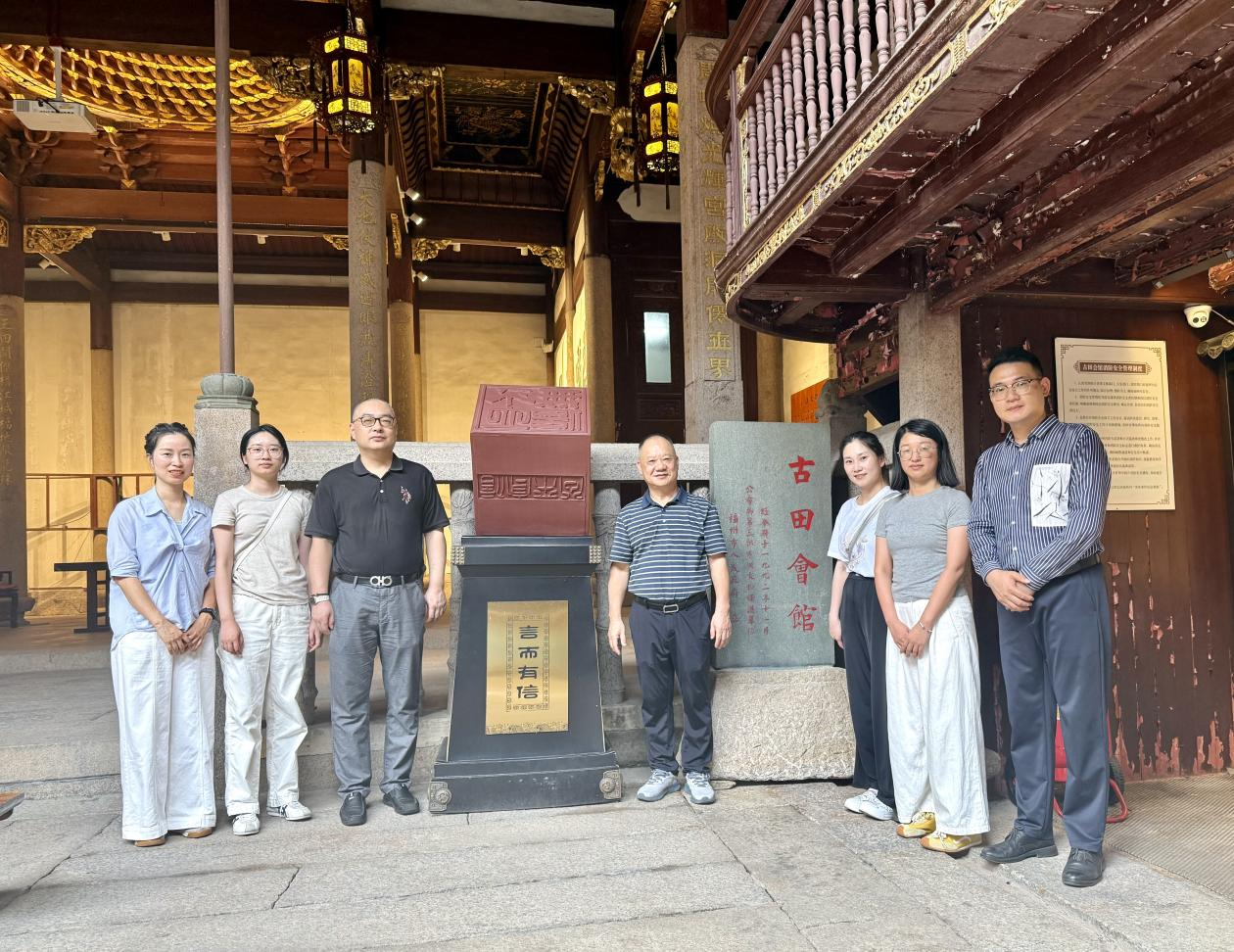 古田会馆作为福建省公民思想道德教育馆、省级诚信廉洁教育基地和省直机关廉政教育点,承载着传承福州深厚商业历史与文化底蕴的使命。支部书记罗向阳带领大家依次参观了台江诚廉文化四大优势、台江五大名商诚信故事、福州家风家训六大特点、福州诚信建设七大成就、青石方碑等内容,他向大家讲解了福州台江商贸“诚信为本,一诺千金”的经商理念,要求支部党员充分感受“忠信为本、孝悌为基”等家风家训和“诚廉基因,以史为鉴”的文化内涵,以中华优秀传统文化丰富思政课教学内容,推动思政课建设改革创新。