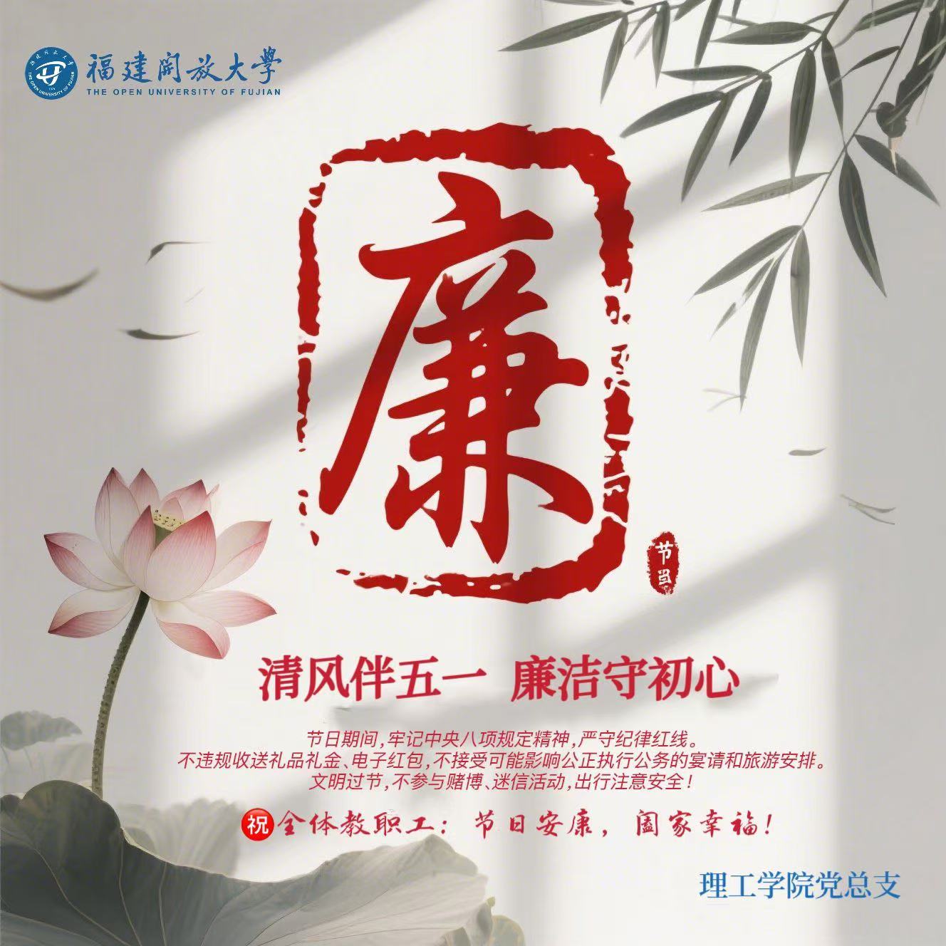 “节点”亦是“考点”,学院紧扣春节、端午、中秋等重要节假日,以AI技术为抓手打造系列廉洁文化传播载体,运用AI绘图工具生成主题鲜明、设计新颖的廉洁海报,将“莲”“竹”等清廉意象与理工专业元素巧妙融合,搭配“科技为骨,廉洁为魂”等警示语,在学院公众号、工作群同步推送,让廉洁提醒既富科技感又具感染力。通过“数字+节日”警示模式,将纪律教育融入日常、抓在经常,有效强化了师生廉洁自律意识,实现廉洁提醒从“被动接收”到“主动认同”的转变,切实把廉洁自律要求转化为师生的思想自觉和行动自觉。