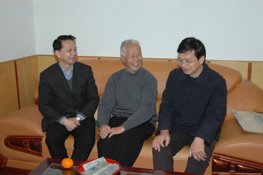 校长陈兴炎(左一)走访慰问老领导陈如亮(中间)