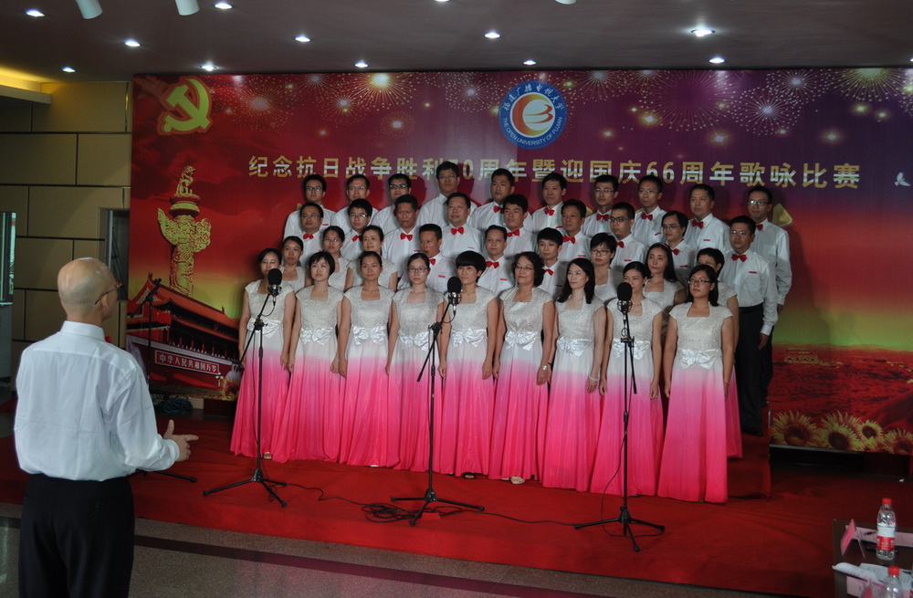 今年是中国人民抗日战争胜利70周年,也是新中国成立66周年,为弘扬伟大的抗战精神,唱响爱国主义旋律,让教职工从悲壮的历史中汲取革命先烈伟大的精神力量,传承以爱国主义为核心的民族精神,学校党委高度重视并专题部署系列纪念活动。9月29日下午,在左海校区多功能厅举行的大型歌咏比赛把纪念活动推向高潮。飞扬的歌声,吟唱难忘的岁月;熟悉的旋律,演绎激越的时代。以声传情的大合唱,回荡着中华民族当年的英雄浩叹。